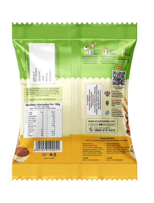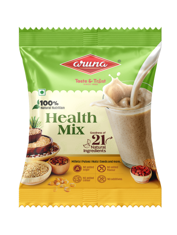 Fuel your day with the wholesome goodness of Aruna Health Mix, a nutritious blend of millets, pulses, nuts, and seeds — carefully chosen to support a balanced lifestyle. Crafted with 21 natural ingredients, this mix is a powerhouse of protein, fibre, and essential minerals.